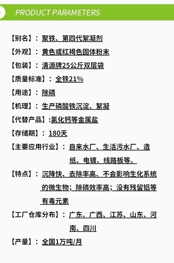 2、投加景的確定,聚合硫酸鐵的投加量計算,根據(jù)原水性質(zhì)可通過生產(chǎn)調(diào)試或燒壞實驗視礬花形成適量而定.制水廠可以原用的其它藥劑量作為參考,在同等條件下本產(chǎn)品與固體聚合氧化鋁用量略低,是固體硫酸鋁用量的1/3-1/4。如果原用的是液體產(chǎn)品,可根據(jù)相應(yīng)藥劑濃度計算酌定。